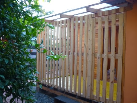 Geralmente as pessoas optam na colocação de vidro mas preferimos pinus estilo grade com uma porta que abre para fora. Foi confeccionado no mesmo estilo do nosso portão. (Ver post outubro foto do portão novo).