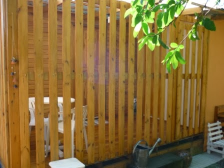 Aqui nós passamos uma demão só. A madeira fica mais clara. Já tem até regador e banquinhos na parte dos fundos; mas isso aí já é para outro post.
