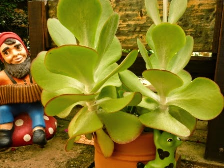 Na companhia do gnomo está a Orelha de Elefante. Esta suculenta impressiona pelo seu tamanho; suas ramificações onde sai a flor está com 80cm de altura.